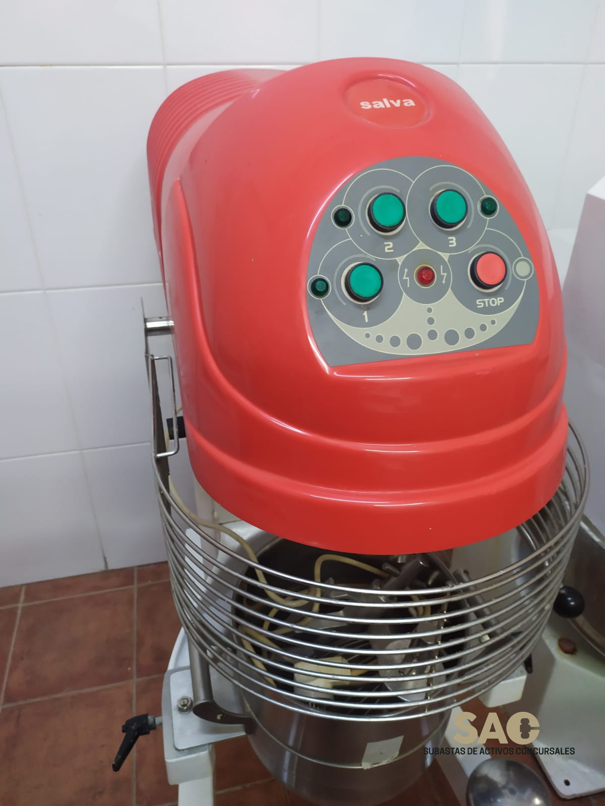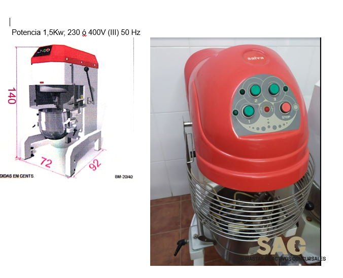 Batidora industrial. Armazón construido en acero pintado epoxi. Movimiento planetario, (rotan y giran sobre si mismo los útiles de trabajo) que bate y amasa uniformemente el producto. Tres velocidades. Palanca para facilitar el movimiento de subida o bajada del perol. Con juego de peroles de 20 y 40 lts, y sus accesorios (batidor, gancho amasador y escudo) en acero inoxidable. Con protecciones necesarias conforme a Normativa CE;