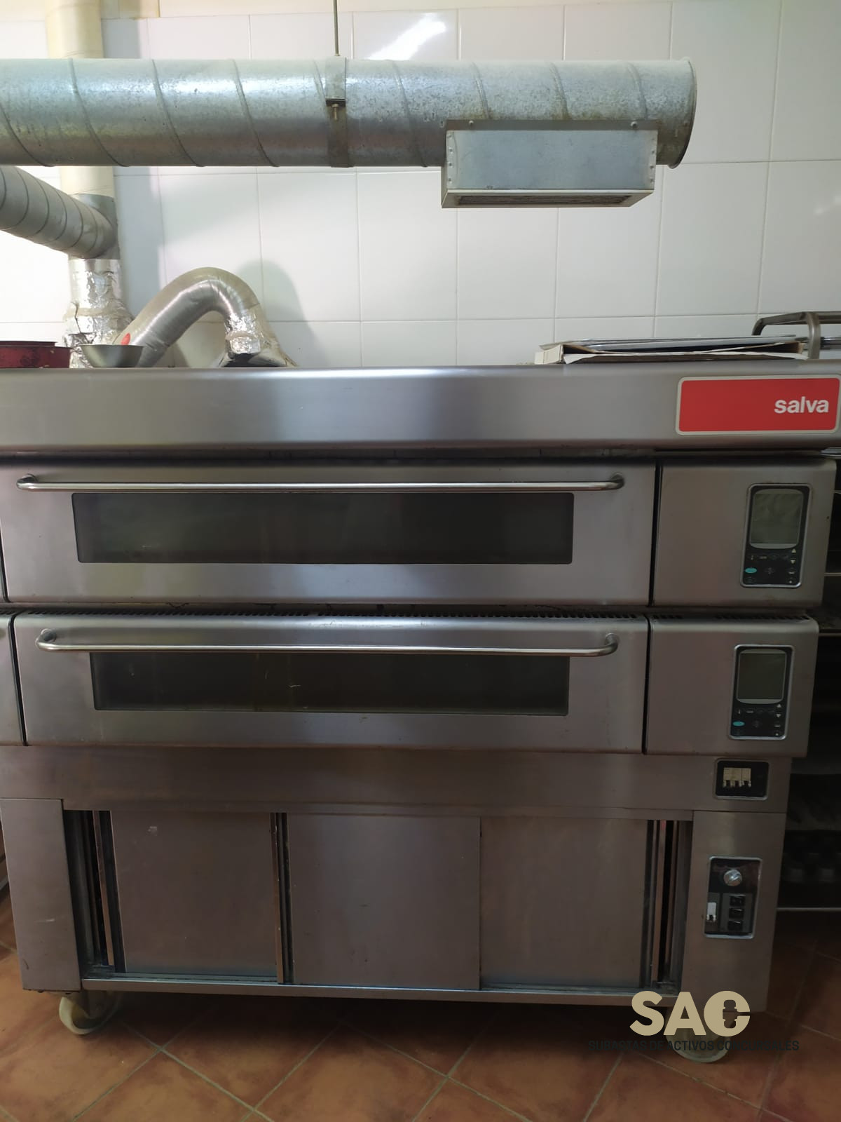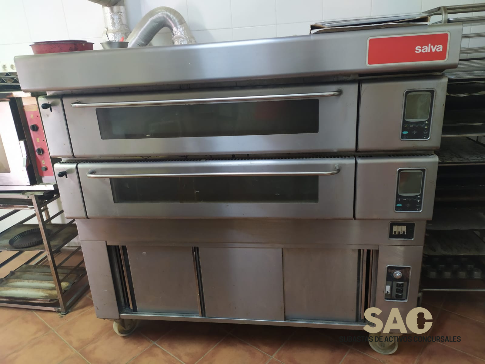 Formado por dos módulos eléctricos de cocción de 20 cm de altura útil. Cada módulo tiene capacidad para 4 bandejas de 60×40 cm. Puerta abatible hacia el exterior, con gran mirilla y alumbrado halógeno en los dos laterales de la cámara de cocción. Todos los mandos situados en el frente. Posibilidad de utilizar el “economizador de energía” en el caso de dos o más módulos. Cada módulo de cocción lleva un panel de mandos digital con cristal líquido que controla la potencia en el techo, suelo y boca, además de temperatura, alarma sonora para tiempo de cocción y posibilidad de arranque temporizado. Los módulos de cocción ensamblados con base y encimera, montados sobre estufa de fermentación con ruedas. Frente, puertas, armazón exterior y colector general en acero inoxidable. Con protecciones necesarias conforme a Normativa CE. Potencia 19,2 Kw; 230/400V (III)