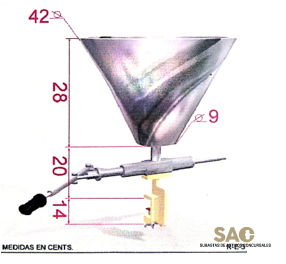 Funcionamiento manual. Construida íntegramente en acero inoxidable aquellas partes en contacto con la crema. Émbolo en material plástico especial. Desmontable para facilitar su limpieza. El soporte en aluminio puede fijarse a una mesa. Capacidad de la tolva 6,5lts. Se suministra con tres boquillas diferentes de 5,5, 8 y 10mm de diámetro