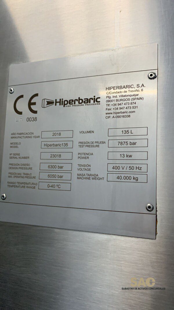 Hiperbaric 135 está orientado a producciones medianas. Su vasija de 135 litros (36,7 galones) y su diámetro de 300 mm (11,8 pulgadas), permiten procesar productos de mayor tamaño con un buen coeficiente de llenado, alcanzando una capacidad productiva aproximada de 670 kg/h (1.480 lbs/h).